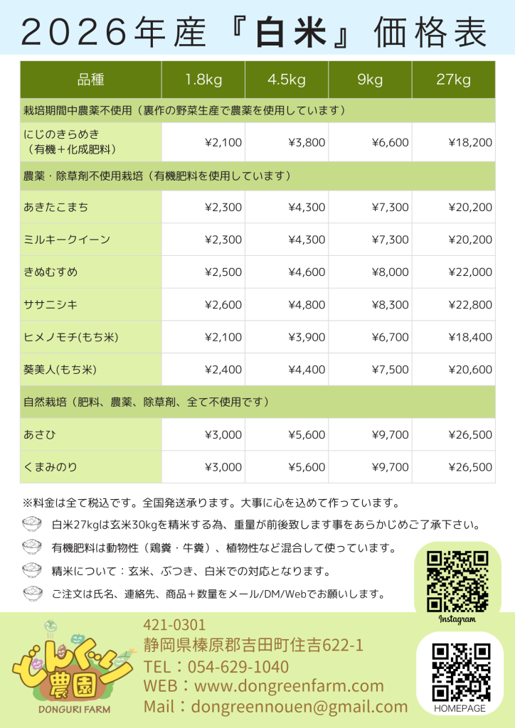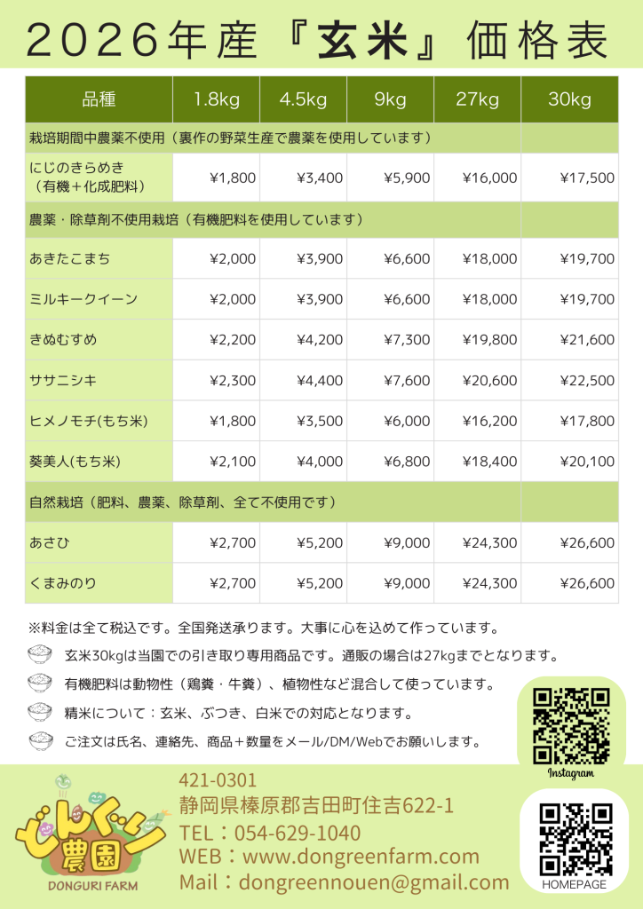 平素、どんぐり農園のお米をご愛顧頂きまして、ありがとうございます。2026年産のお米の販売価格のお知らせです。今年度から白米、玄米、ぶつきで価格を変えさせて頂きました(大変恐縮ですが、精米料を頂く事に致しました)。